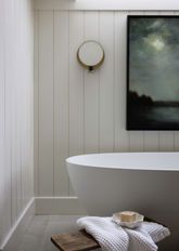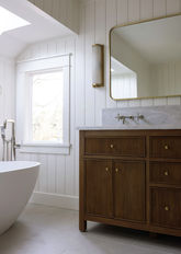We pulled together classic elements with modern fixtures and many nods to the natural PNW beauty that surrounds this home to create 4 unique spaces that tie the house together. Primary bathroom, powder bathroom, boys bathroom and mudroom.